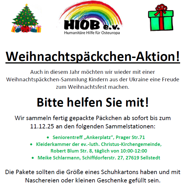 Die Weihnachtspäckchen werden dieses Jahr an die Kinder in Zhovten (Petrovivinka) und Odessa zum 24.12.25 in die Ukraine gebracht.